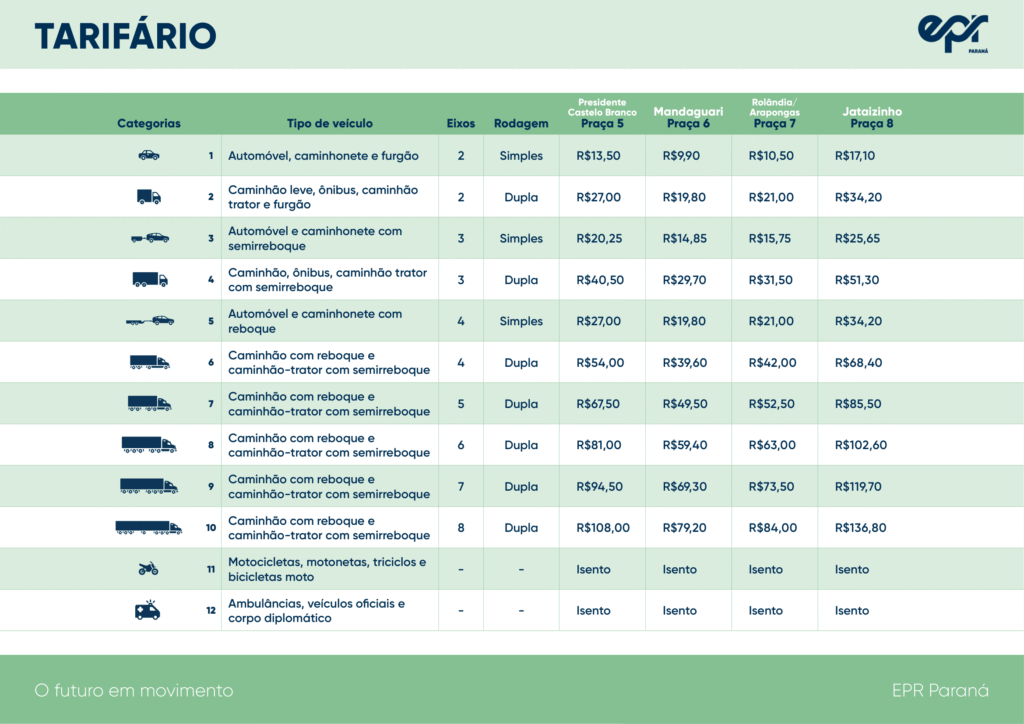 Conforme previsto no Contrato de concessão n°05/2024, terão trânsito livre no Sistema Rodoviário e ficam, portanto, isentos do pagamento de Tarifa de Pedágio as motocicletas, motonetas, triciclos e bicicletas moto, as ambulâncias, os veículos oficiais, próprios ou contratados de prestadores de serviço, da União, dos Estados, dos Municípios e do Distrito Federal, seus respectivos órgãos, departamentos, autarquias ou fundações públicas, bem como os veículos de Corpo Diplomático.